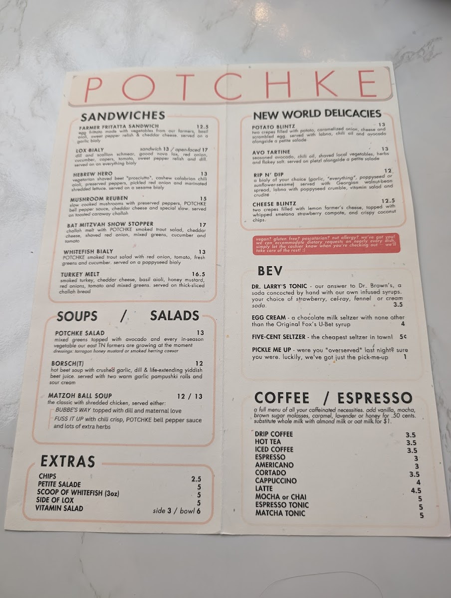 Welcome to Potchke Deli, a vibrant culinary gem nestled in Knoxville’s heart at 318 N Gay St. This deli redefines comfort food with a thoughtful menu that harmoniously blends classic Jewish flavors with modern flair. The highlights include the beloved Matzo Ball Soup at $14.40, and the indulgent Pastrami, Egg & Cheese sandwich at $18.00. Each dish is crafted with fresh, high-quality ingredients that promise to excite your palate.